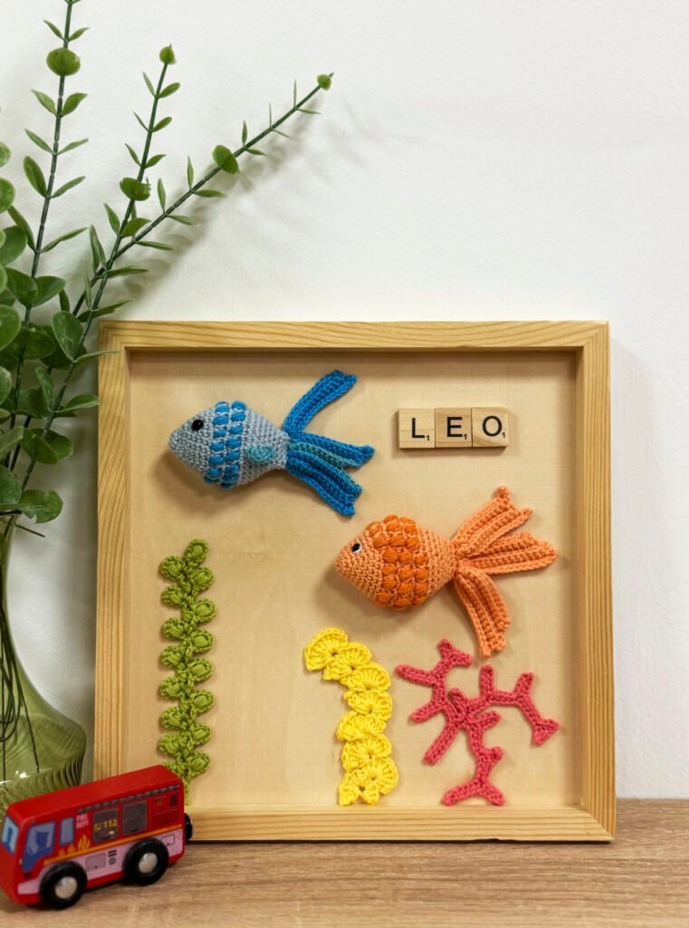 Este cuadro artesanal del fondo marino está hecho a crochet y es ideal para decorar habitaciones con un toque original, tierno y lleno de vida.