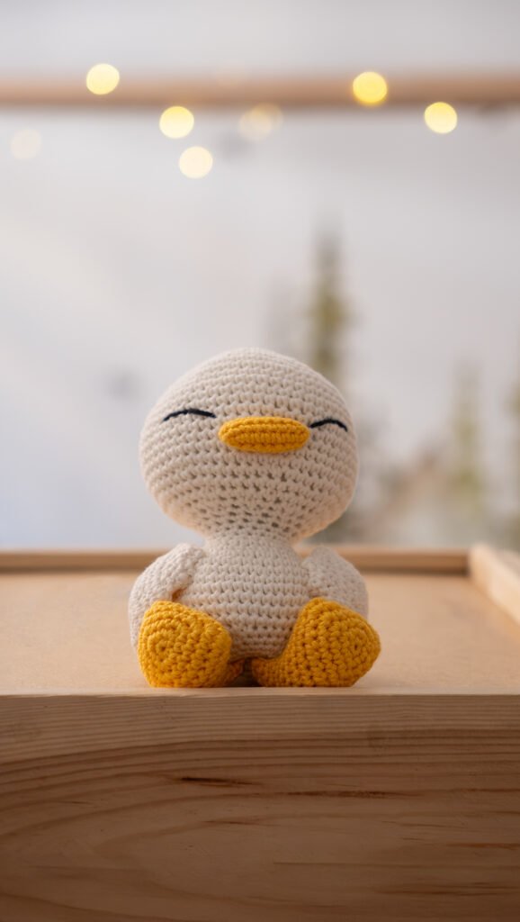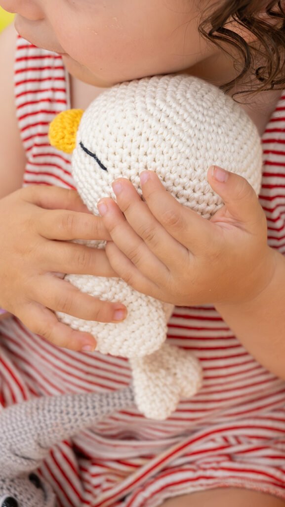 Es un patito de crochet con su pancita blandita, su piquito curioso y sus alitas simpáticas lo convierten en un peluche adorable, perfecto para acompañar siestas, juegos y noches tranquilas.